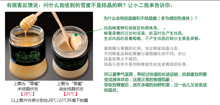 蜂蜜在每天春天13~14℃时,容易结晶,若低于此温度时,虽然葡萄糖的过饱和程度加大,但由于蜂蜜中果糖、麦芽糖、糊精和胶状体物质等在低温下的粘滞度和密度却大大提高,从而降低和阻碍结晶核的运动和扩散作用,结晶反而迟缓。若高于此温度,蜂蜜的粘滞度虽然降低了,但是葡萄糖的溶解度却提高了,从而减少了溶液的过饱和程度,也使结晶变慢,甚至使结晶融化。