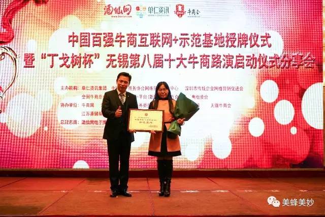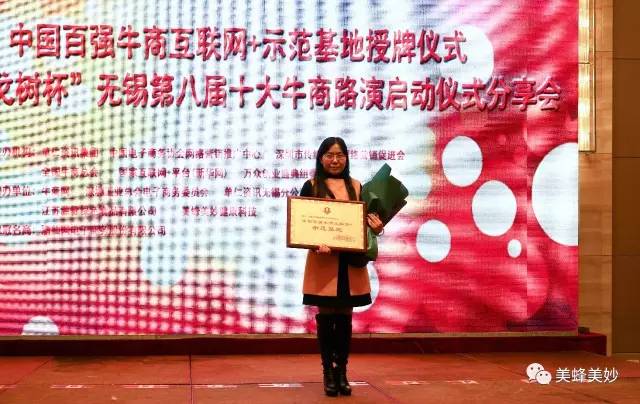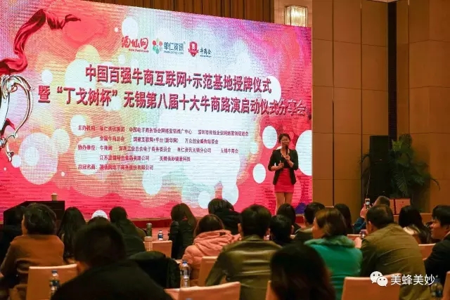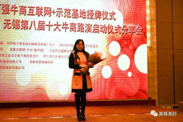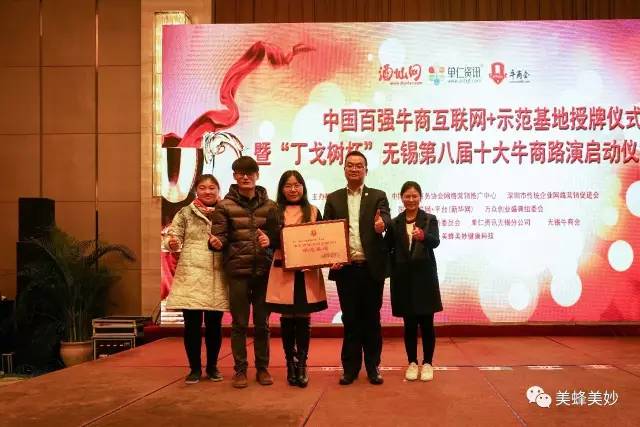 12月16日下午,中国百强牛商互联网+示范基地授牌仪式暨“丁戈树杯”无锡第八届十大牛商路演启动仪式分享会在无锡凯莱大酒店举行,美蜂美妙健康科技有限公司荣幸获得“中国百强牛商互联网+示范基地”称号,接受授牌,并与各大牛商分享自己的互联网之路。